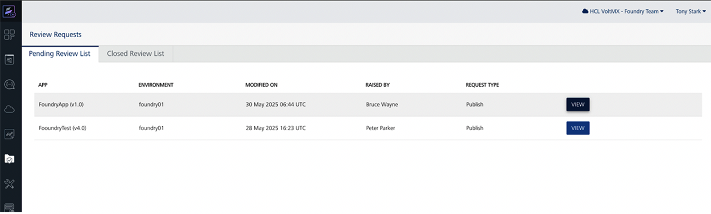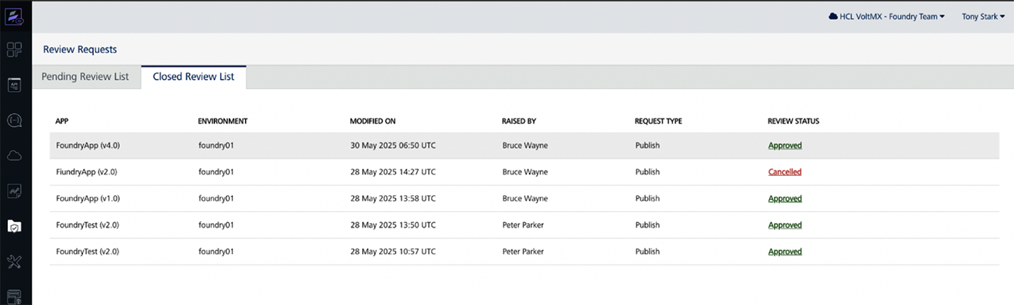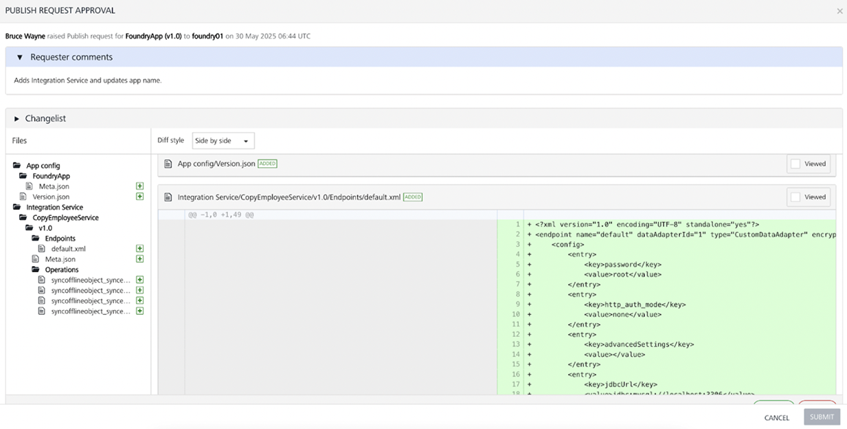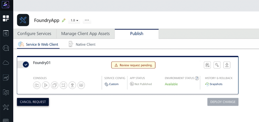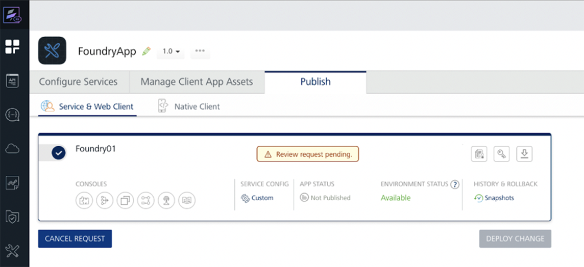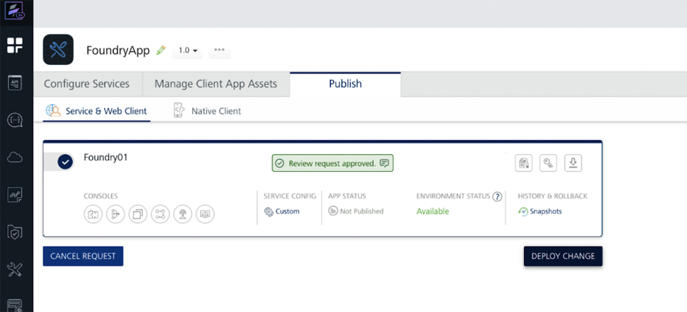 Foundry supports environment-level governance to enable a controlled publishing workflow that ensures application changes undergo proper review before being deployed to target environments.