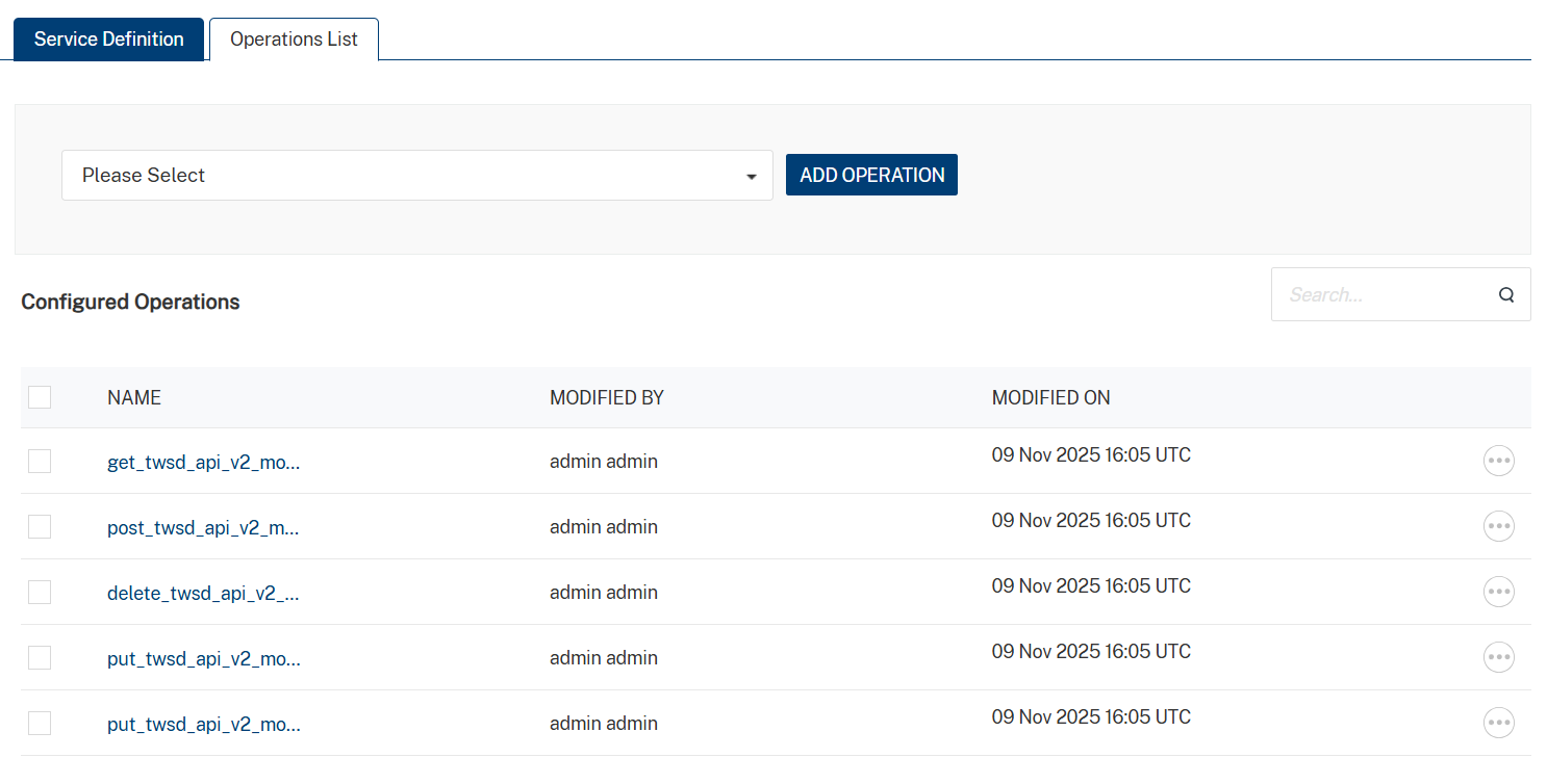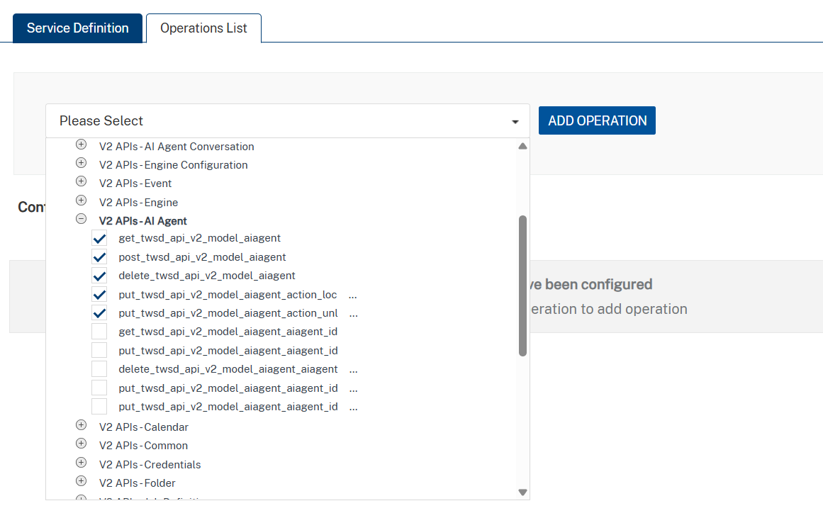 After you create a service, you can view existing operations and create new ones on the Operations List tab. For an HCL Universal Orchestrator endpoint, the operations correspond to the paths defined in the specification file (for example, POST AI Agent model or PUT AI Agent model).