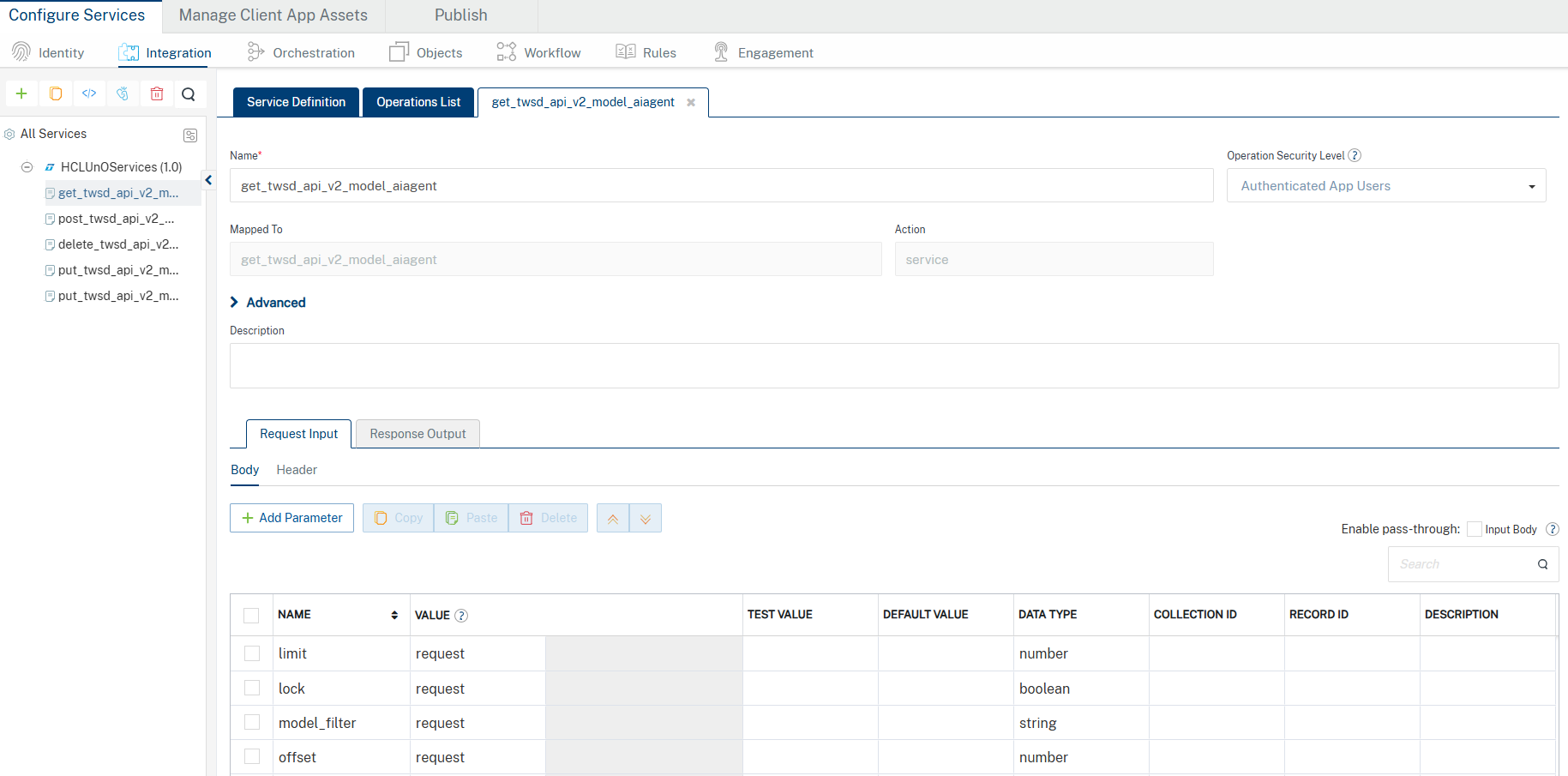 Note: For more information on Externalizing Identity Services, refer to Replace the Identity Service references in a Foundry app.TEST VALUE Specifies the value of the parameter that is used while testing the service. DEFAULT VALUE Specifies the value of the parameter that is used if the test value is empty. DATA TYPE Specifies the data type of the parameter. Contains the following options: string A combination of alpha-numeric and special characters. Supports all formats (including UTF-8 and UTF-16) with no maximum size limit. boolean A value that can be true or false. number An integer or a floating point number. date A value that contains the day, month, year, and time. collection A set of multiple records. record A set of multiple objects. > Note: The binary data type is not supported for operations in HCL Universal Orchestrator. Record ID Specifies the ID of the record that contains the parameter. This field is applicable for nested payloads. Collection ID Specifies the ID of the collection that contains the parameter. This field is applicable for nested payloads. Description Specifies the description for the request parameter. -