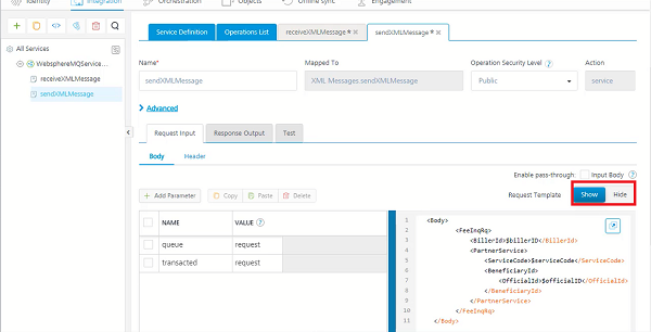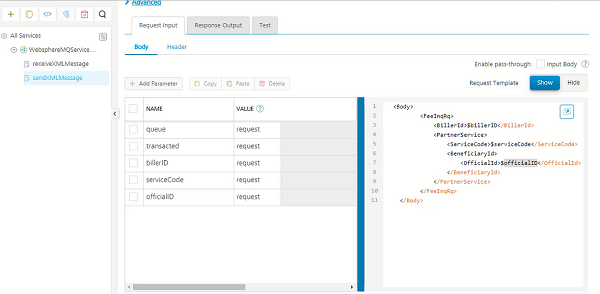 Click Show button and enter the message template in the right pane. The message template is used to send a message to IBM MQ server.