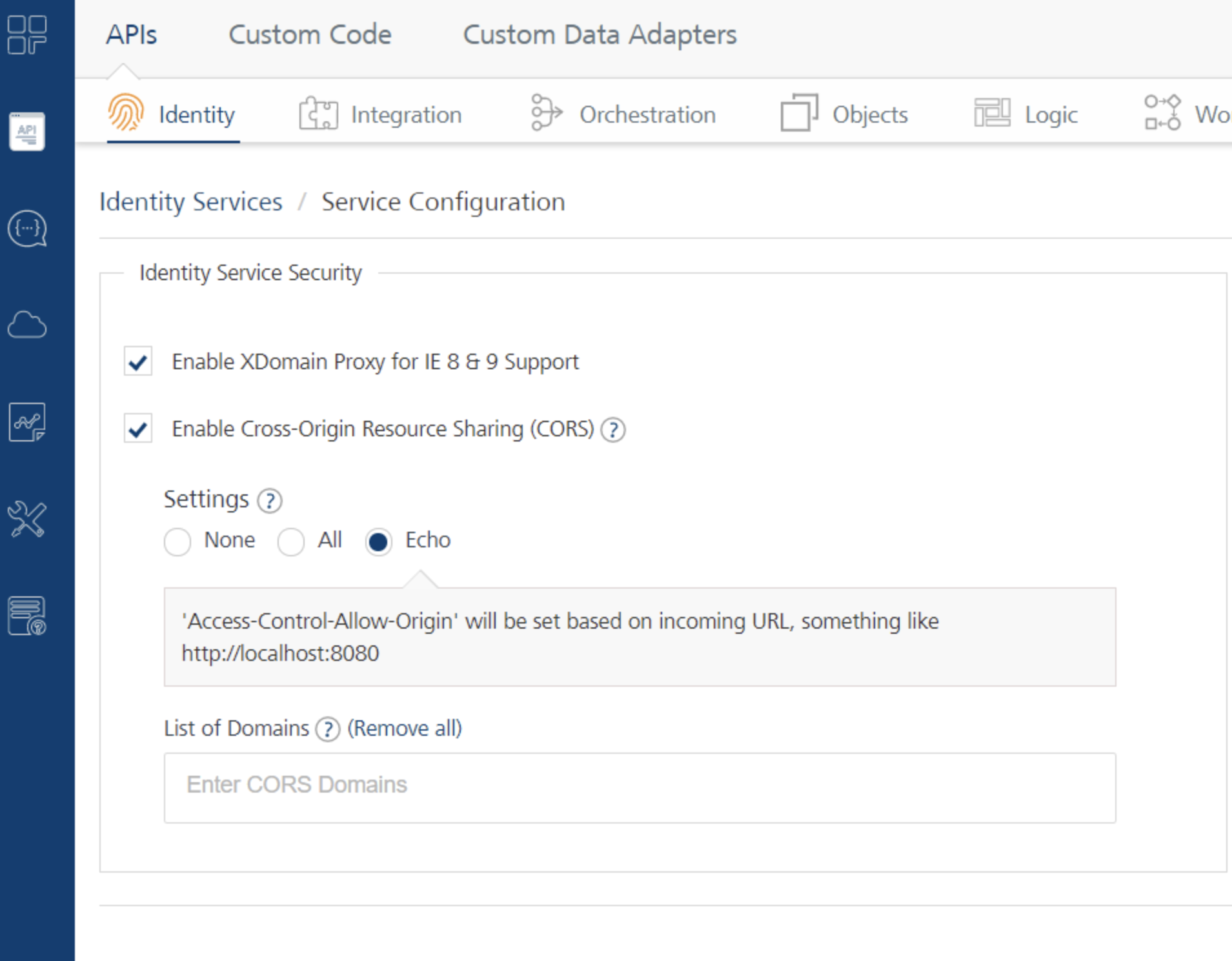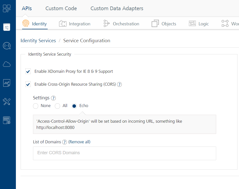 - In the Identity Service Security section, select Enable Cross-Origin Resource Sharing (CORS).