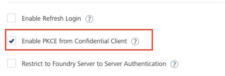 On the Identity service configuration page, Foundry provides the Enable PKCE from Confidential Client check box.