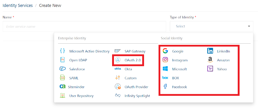 With Volt MX Foundry OAuth 2.0 identity service, a user can access some of the external OAuth service providers such as Salesforce, Google, Amazon, Microsoft, Instagram, Yahoo, and Box for authentication.