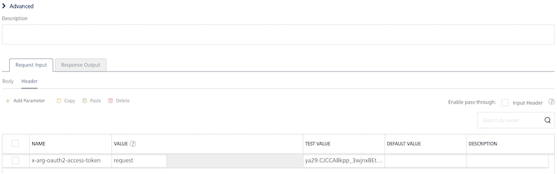 Also, If a custom integration service (for example, MongoDB or RAML) is linked to an OAuth2 identity service, while testing an operation of the integration service from Admin Console, you must pass thex-volt-mx-oauth2-access-tokenas a header andaccess_tokenas a header value.