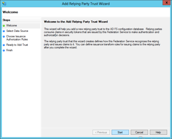 From the Actions pane, click the Add Relying Party Trust. The Add Relying Party Trust Wizard appears.