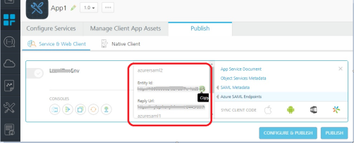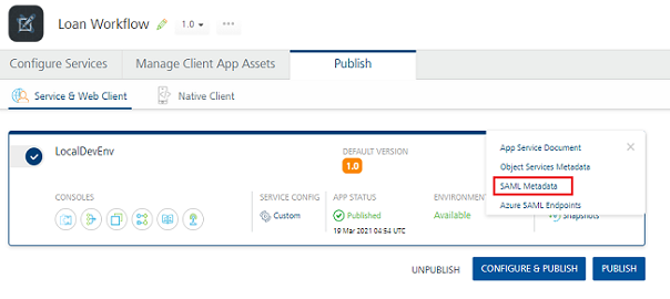 - Publish the app to an environment. The system generates the service provider's metadata for your identity provider.
