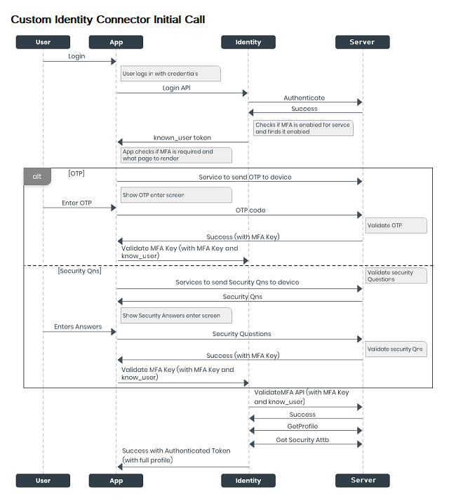 The app contains the custom logic internal to its implementation to fetch MFA. The configured MFA can be of any type, namely: OTP, and/or security questions, and/or any custom logic to obtain an MFA key.