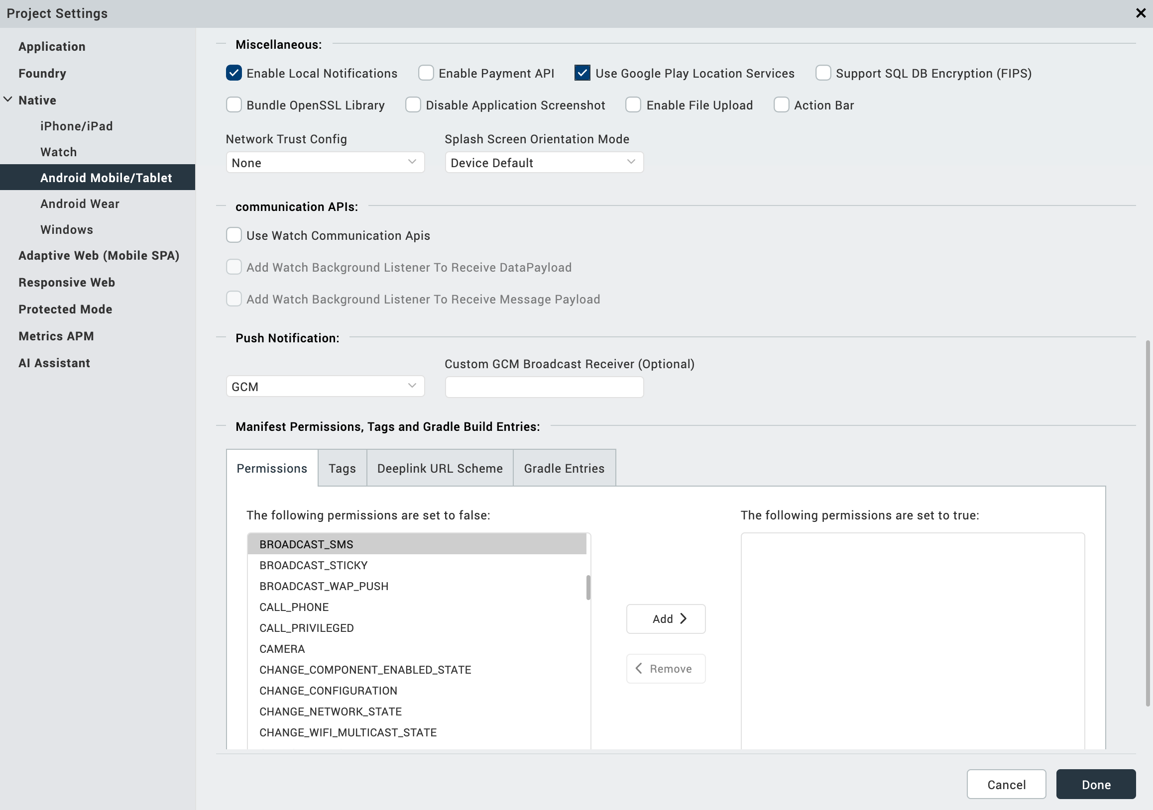 - In Push Notifications section, select either GCM or FCM for the engagement APIs to work.