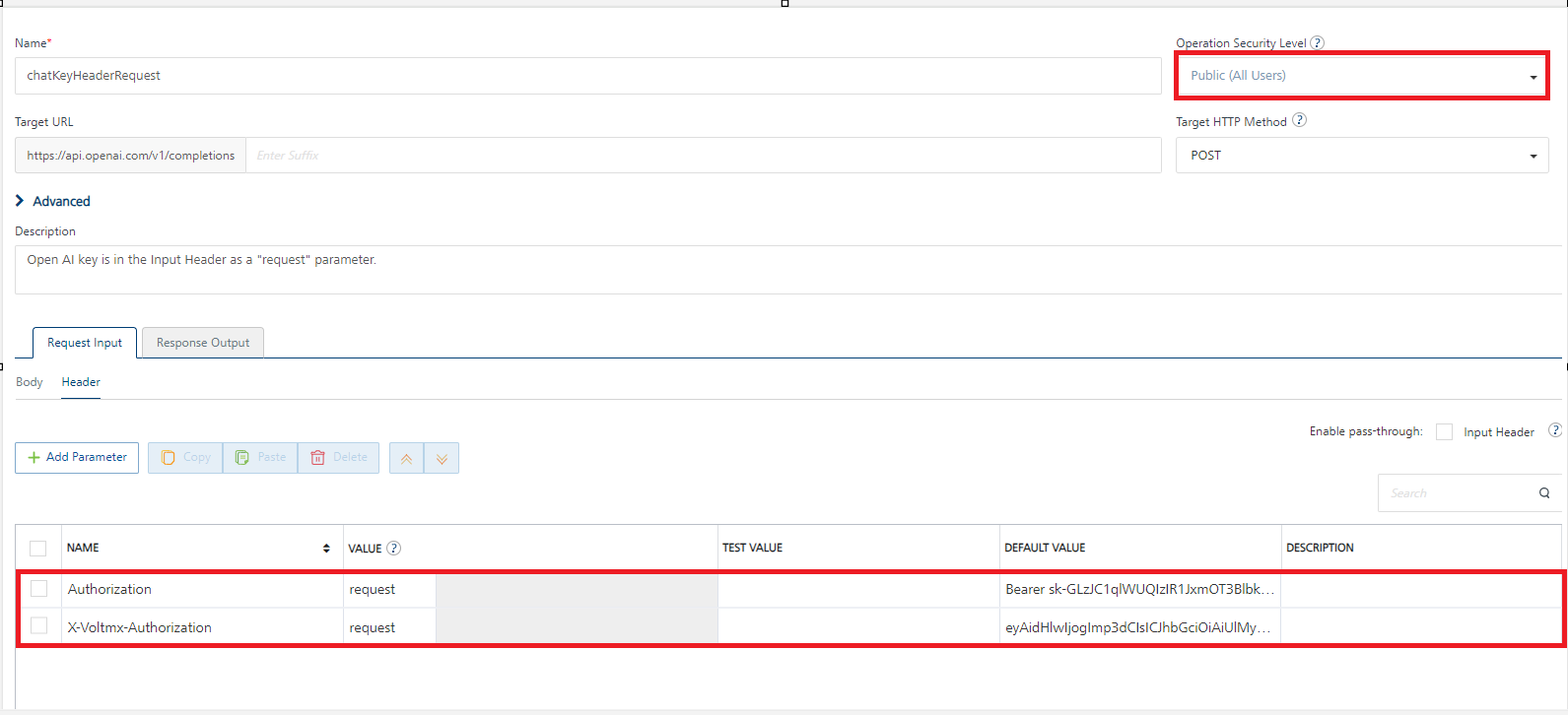 Note: If the header value is scoped as a Request, and the bearer token is passed when the operation security level is Public, the X-Voltmx-authorization code should also be passed as Request.