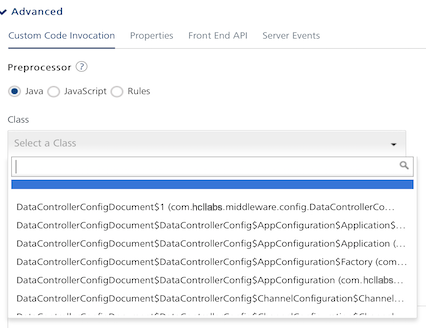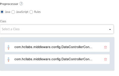 - Select Java, and in the Class text box, enter the preprocessor class. This step enables a developer to include any business logic on the data before forwarding the request to the external data source.