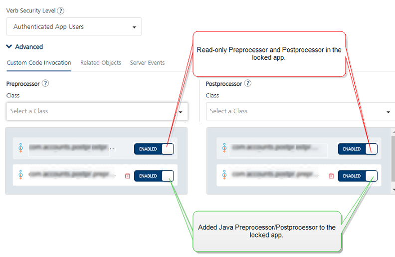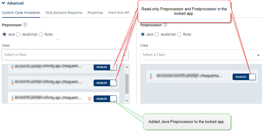 In Advanced > Custom Code Invocation: The locked Java pre-processors and post-processors are enabled by default. You can choose to enable/disable them for your app.- To extend the locked base custom Java code, select new Java pre-processors and post-processors from the list. You can arrange for the selected pre and post-processors to be executed in the desired order during the operation call.