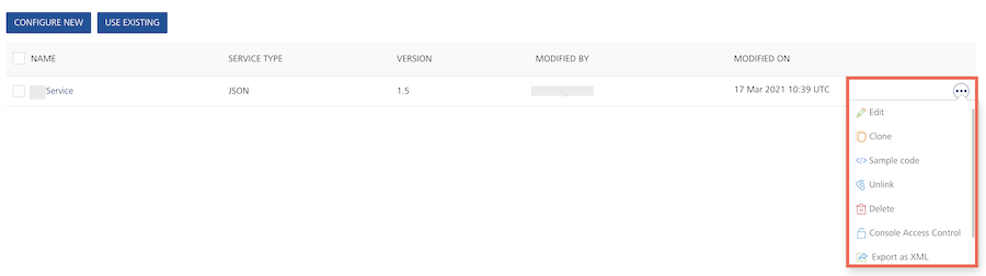 To perform various actions on an existing service, click the contextual menu of the required service.