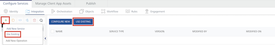 In the Integration, click *USE EXISTING* from the tree in the left-pane or right pane.
