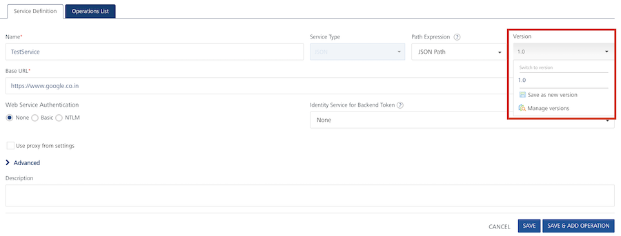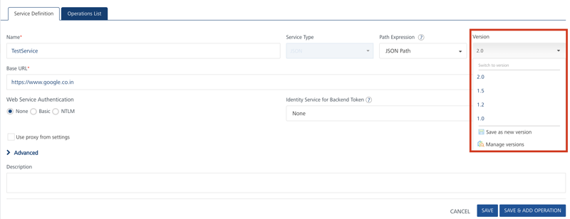You can save an integration service to a new version. Saving a new version of an integration service unlinks the current version of the service from the Volt MX Foundry application, and links the new version. A Volt MX Foundry app can be associated with only one version of an integration service.