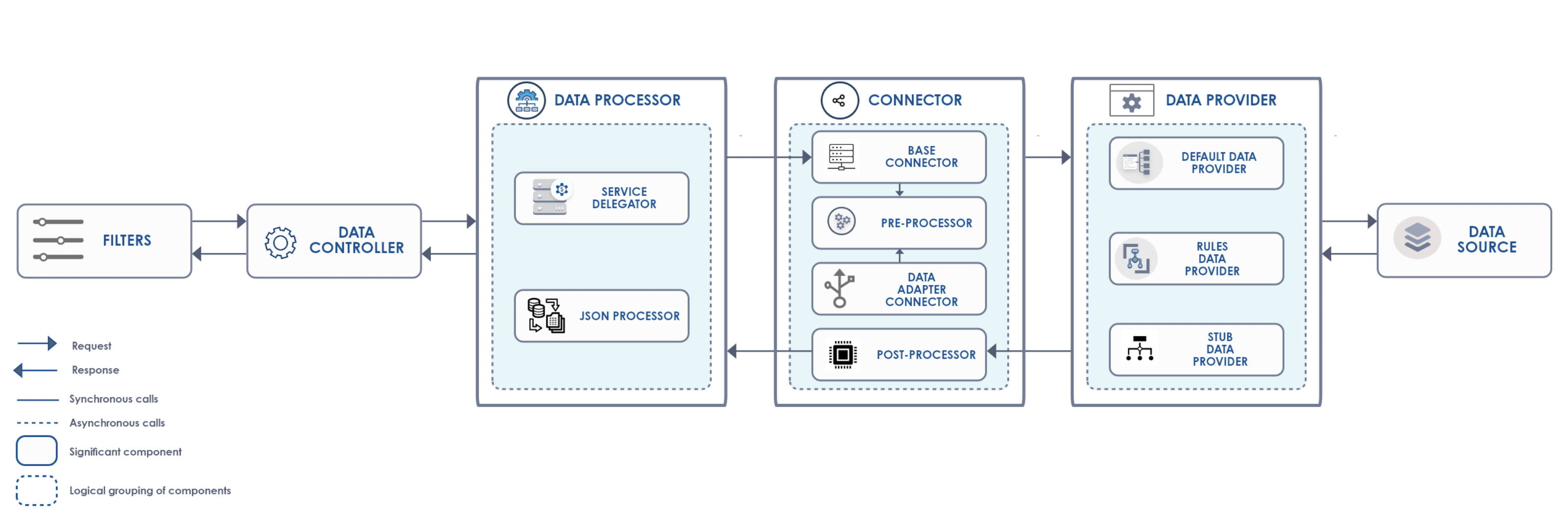 - Invokes data source connectors which eventually make a service call to the external data source.