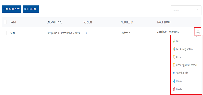 To perform various actions on an existing service, click the contextual menu of the required service.