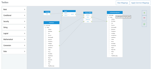 When the visual designer is in Edit mode, the Toolbox pane lists built-in functions on the left side of the view.