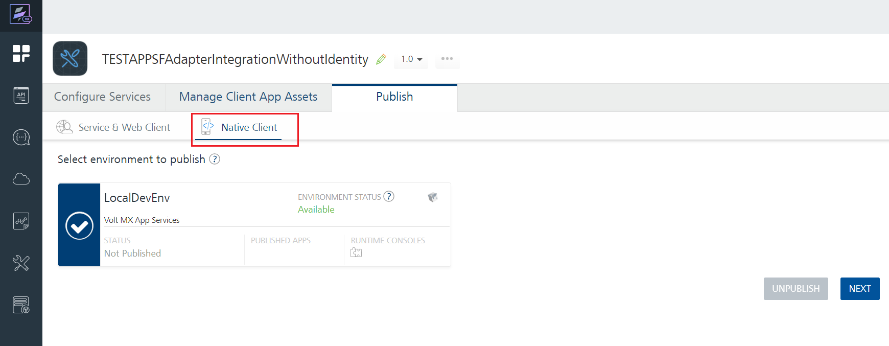 - In Volt MX Foundry Console, go the app for which you uploaded native client binaries.