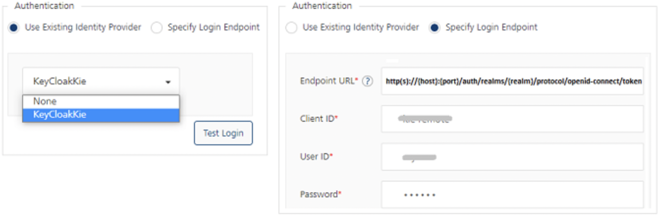 Note: If RedHat PAM Server is integrated with Keycloak, and if authentication is chosen as Use Existing Identity Provider or Specify Login Endpoint, in this case, these User ID and Password are optional. Refer to Authentication in this section.