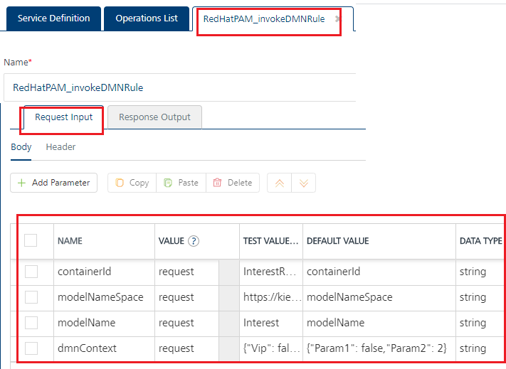 DMNs Operations Request Input Parameters * Do not edit these param names Response Output Parameters