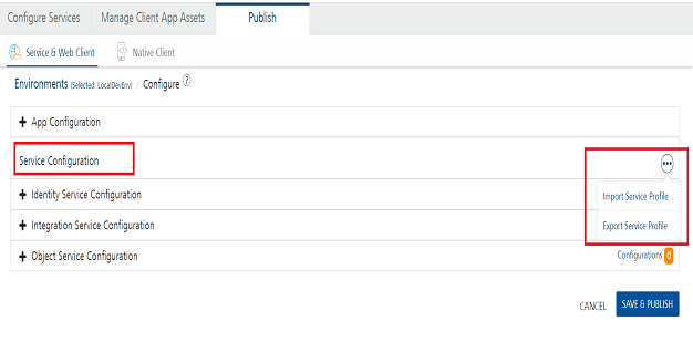 Important: After you import a service profile, the existing configuration parameters get modified. This modification is based on the data imported before the SAVE & PUBLISH button was clicked.