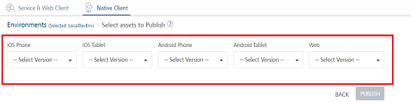 For native client binaries, if you select a binary version from the Platforms drop-down list and publish as preview or publish it to Enterprise App Store (EAS), the system publishes the selected version to EAS. EAS supports storing all the uploaded versions of native client binaries in the database.