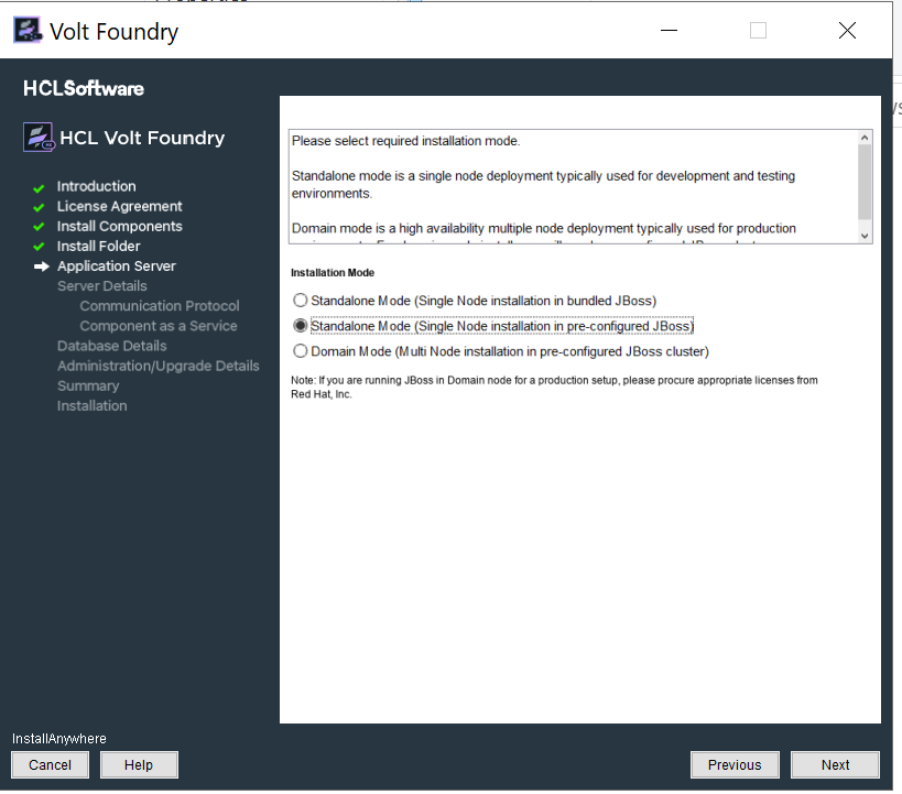Important: To install Volt MX Foundry on single node on JBoss that is installed along with the Volt MX Foundry Installer, click Standalone Mode (Single Node installation in bundled JBoss). For more details, refer to Standalone Mode (Single Node in bundled JBoss) Installation.