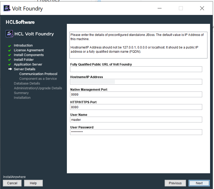 Hostname/IP Address: Enter public Hostname/IP of JBoss master node. Ensure that you have access to JBoss master node from your installation system.