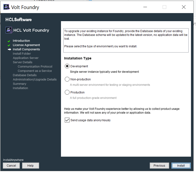 - Select the Send usage data anonymously check box. Allows HCL to collect product usage information to make your Volt MX Foundry experience better. HCL does not save any of your private or application data. By default this check box is selected.