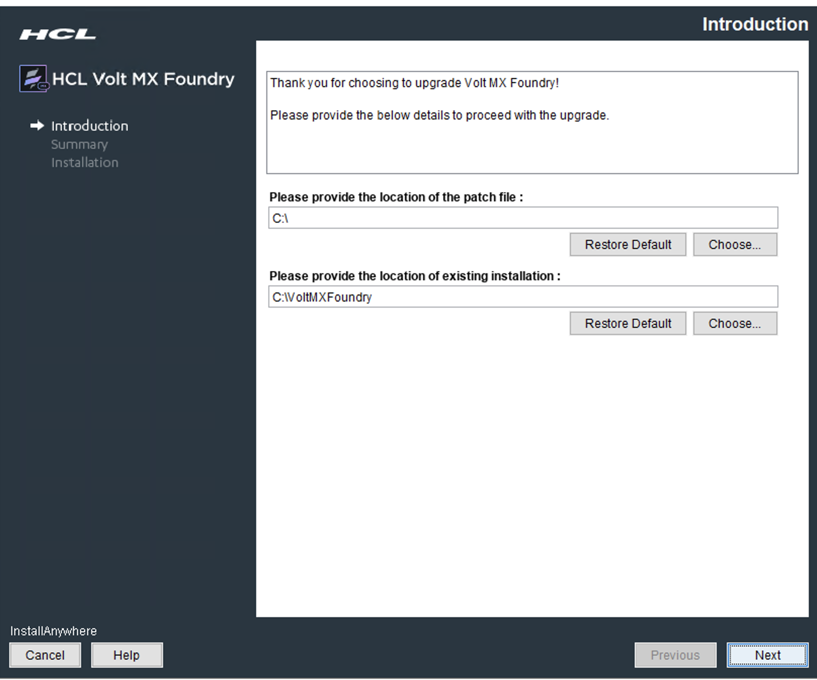 - Next, the Introduction window appears asking for following details: Enter the details to proceed with the upgrade: