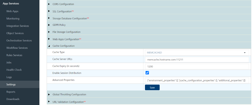 UPDATE <VOLTMXADMINDB>.server_configuration set prop_value = '<memcache_hostname>’:’<memcache_port>’' , created_date = CURRENT_TIMESTAMP , updated_date = CURRENT_TIMESTAMP WHERE prop_name = 'memcache.cluster';Verification: To verify whether the memcache configuration is successfully done, go to the Health Check page and look for Access to Cache entry.