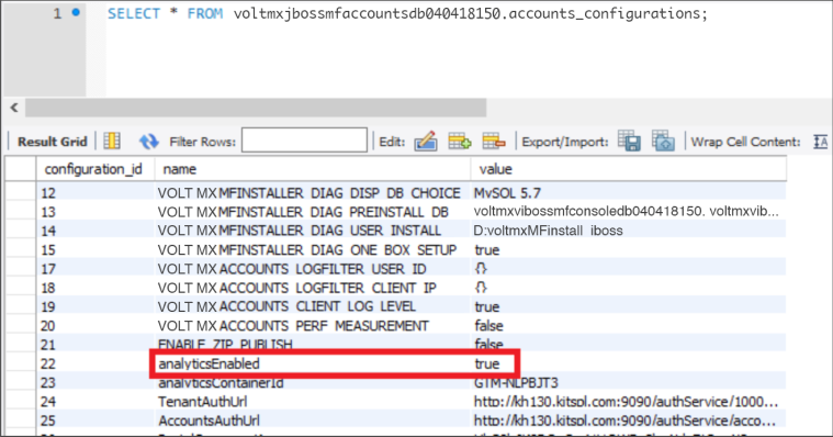- Go to the Accounts database configured for the Volt MX Foundry installation.