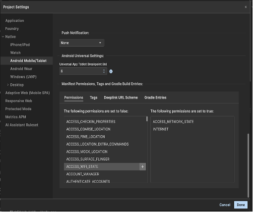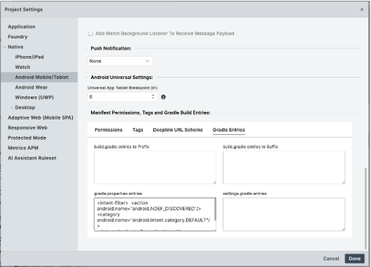 Open Project Settings -> select Native Tab -> select Android Mobile/Tablet -> In Tags section -> Child tag entries under main launcher < activity > tag -> add intent filters and click Done