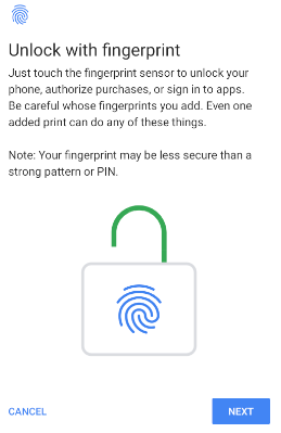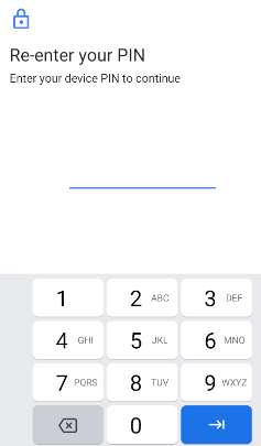 If the device does not support the BIOMETRIC_WEAK or BIOMETRIC_STRONG authenticators, the user is directed to the settings screen to register for device credentials such as PIN, Pattern, or Password.