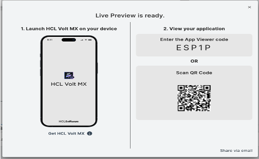 In Iris, you can see a Live Preview is ready window. The window contains App Details and QR code for the web app. Using the details, you can preview the web app on your device. For more details on how to view the app on your device, go to Preview an App on a Device.