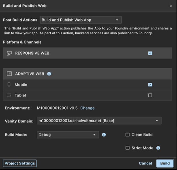 The Build and Publish Web option in builds the application for the selected Web platforms and performs the selected Post Build Action. You must choose the Post Build Action in the Build and Publish Web window, before the build process begins. There are three types of Post Build Actions: