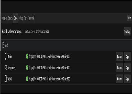 Once the publish process is complete, a Web App URL appears on the Build tab. - Click on the generated URL to preview your Web app in the Live Preview mode.