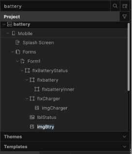 The project contains a single form which contains flex containers for the battery status graphic and the Charger status graphic. The top level form, frmBatteryStatus has an action associated with it's preShow event that makes the api calls to display the charging and battery status for the phone.