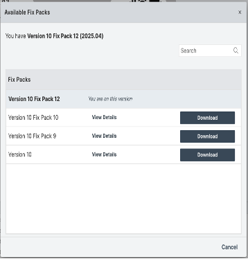 Note: The Available Fix Packs dialog box only displays the Fix Packs that are available on the current version.