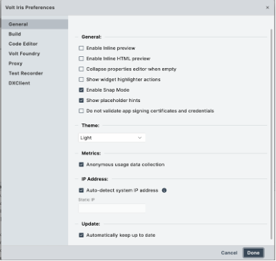 - From the Edit menu of Volt MX Iris, click Preferences.