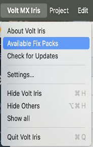 From the Help menu of Volt MX Iris, click Available Fix Packs.