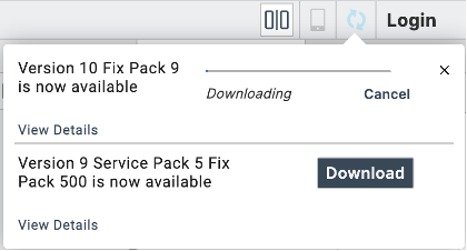 When new updates are available, Volt MX Iris displays a notification and starts the download process. The progress of the Fixpack or ServicePack download appears in the update section of the notification bar.