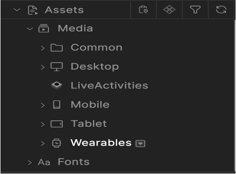 After adding media to a media folder, to see them reflected in Volt MX Iris, refresh the list of media assets by clicking the Refresh Folders icon located on the top left corner of the Assets tab in the Project Explorer.