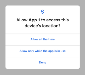 When an app that runs on Android 10 (API level 29) devices requests location access, the following dialog box appears: