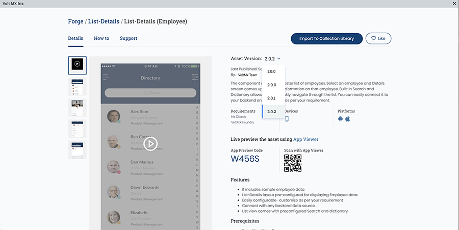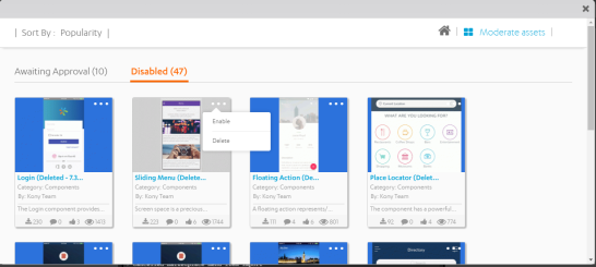 From Volt MX Iris V9 SP2 GA onwards, you can add multiple versions of components from the Templates tab into My Libraries. When you import or add the same version or lower version of an existing component to the My Libraries section, Volt MX Iris displays a message stating that a same version of the component exists. Click OK to add the component. If a higher version of the component is added, Volt MX Iris directly adds the component into My libraries.