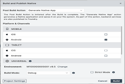 - If choose to build an application for the Android platform in Release mode, then the Android signing details are mandatory. To do so, go to Project Settings > Native > Android Mobile/Tablet. For more details on Android signing details, click here.