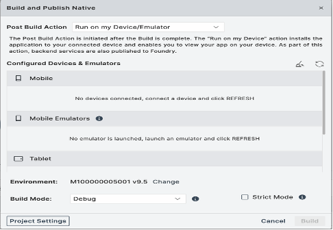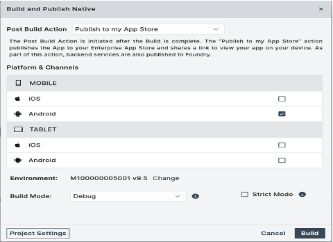 - Build and Publish Native - Builds the application for the selected native platforms and performs the selected Post Build Action. There are three types of Post Build Actions:
