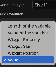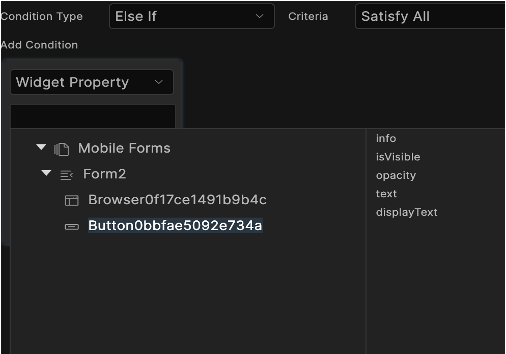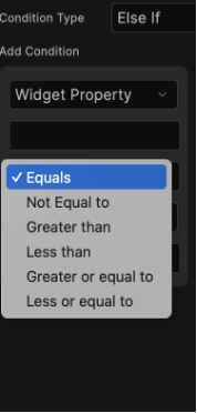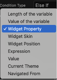 In the bottom pane of the Action Editor, from the leftmost drop-down list, set the condition to Widget Property.
