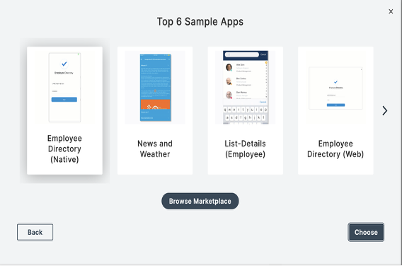 1. Select one of applications and components displayed on the Sample Apps screen, and then click Choose. The selected application or component is imported to your project. Alternatively, you can click Browse HCL Forge to open the HCL Forge website. HCL Forge provides a variety of samples and components that you can add to your project.