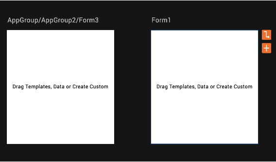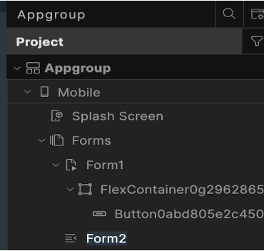 If you choose AppGroup1 and then click Create Form, a new form AppGroup1/Form2 appears with a navigation link connecting to Form1. In the Project Explorer, Form2 is displayed under Mobile > Forms > AppGroup1.